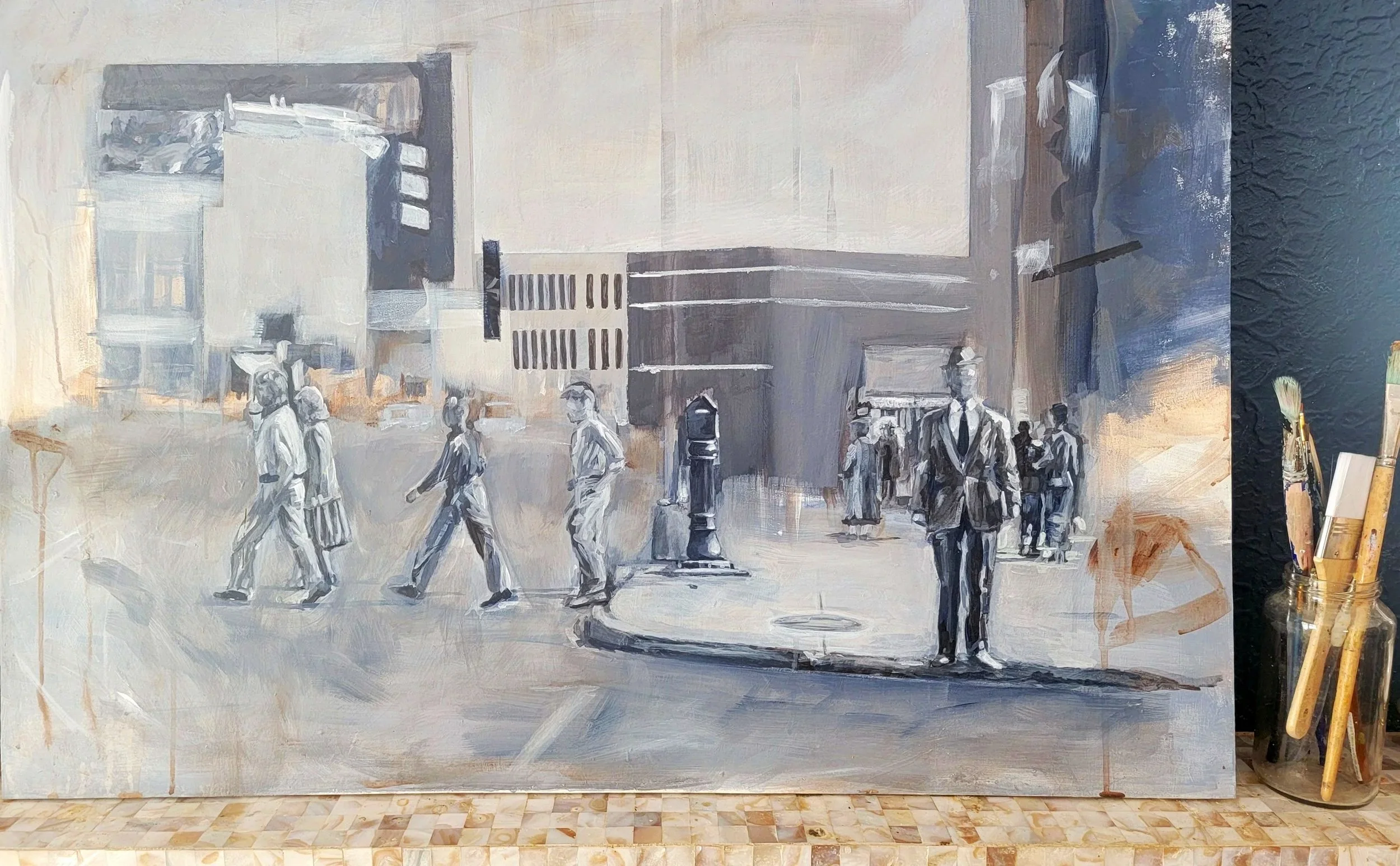 In the ‘Then’ painting, the scene itself is from a picture of downtown Kalamazoo with it’s locally-iconic (for the time) buildings with resident passerbys. The ‘Now’ painting will portray a similar vantage point.